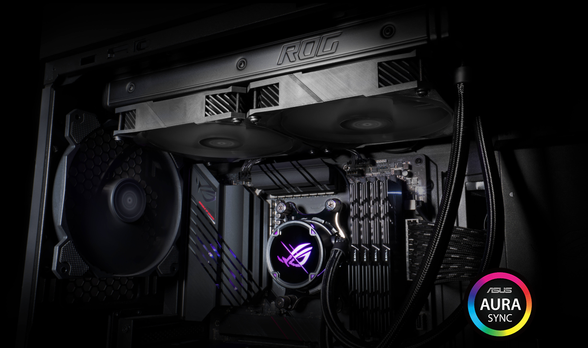 Entfalte deinen StilDie ROG Strix LC II 360 zeigt von Anfang bis Ende die ikonische ROG-Ästhetik. Der eingravierte ROG-Schriftzug auf der Seite des Kühlers ergänzt den schillernden Schriftzug auf den Naben der einzelnen Lüfter. Und das Aura Sync-kompatible Pumpengehäuse erstrahlt mit dem neuen ROG-Logo in einer Farbe deiner Wahl.