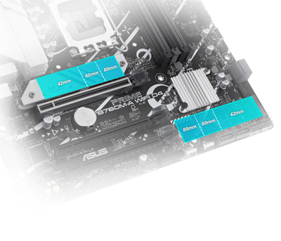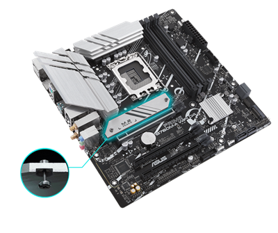Das PRIME B760 Mainboard bietet insgesamt zwei M.2-Steckplätze, die Datenübertragungsgeschwindigkeiten von bis zu 64 Gbit/s über PCIe 4.0 unterstützen und so schnellere Boot- und Ladezeiten von Betriebssystemen oder Anwendungen ermöglichen.