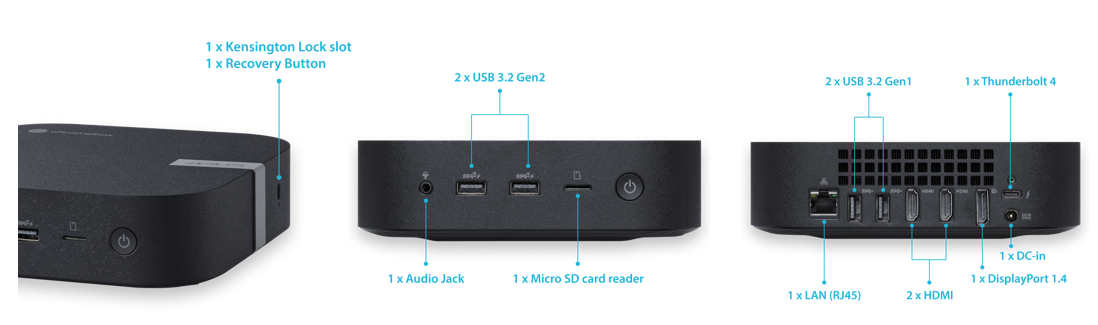 Thunderbolt™ 4 Konnektivität bietet Anwendern unvergleichliche Vielseitigkeit mit ultraschnellen Geschwindigkeiten. Er unterstützt USB-C® Power Delivery und bietet Datenübertragungsgeschwindigkeiten von bis zu 40 Gbit/s, wenn er an Hochleistungsperipheriegeräte angeschlossen ist. Er kann zusammen mit den zwei HDMI-Anschlüssen und dem DisplayPort verwendet werden, um bis zu vier Bildschirme zu unterstützen.