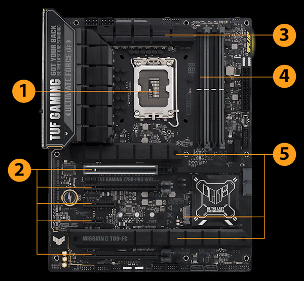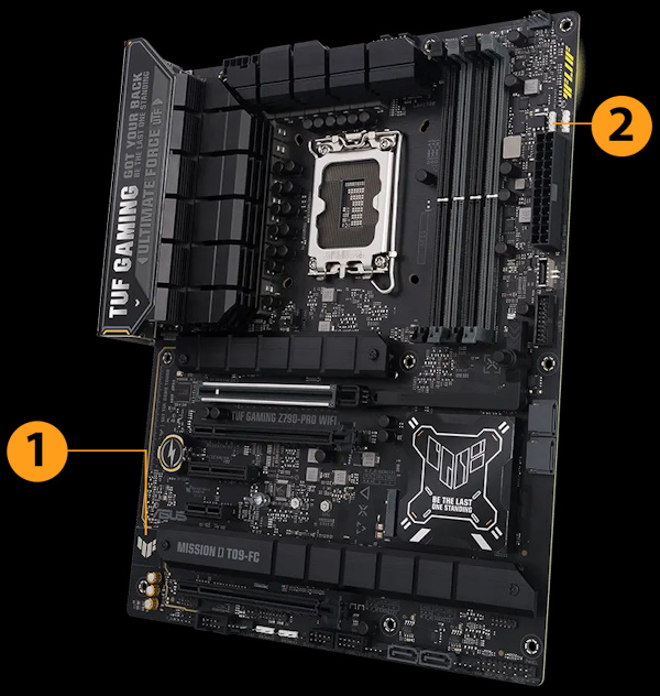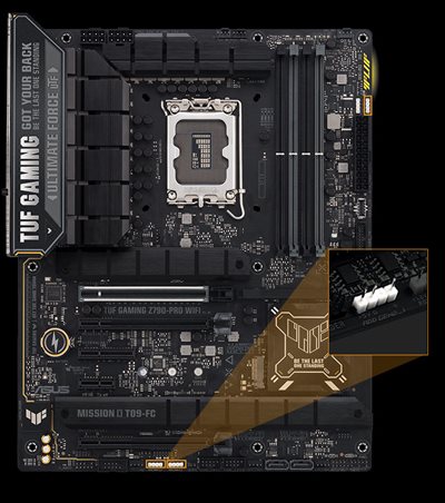 Mit verbesserter Stromversorgung und umfassenden Kühloptionen für die neuesten Intel®-CPUs sowie Unterstützung für DDR5-Speicher und PCIe® 4.0-Speicher ist das TUF GAMING Z790-PRO WIFI die perfekte Grundlage für dein nächstes Intel®-Battle-Rig.