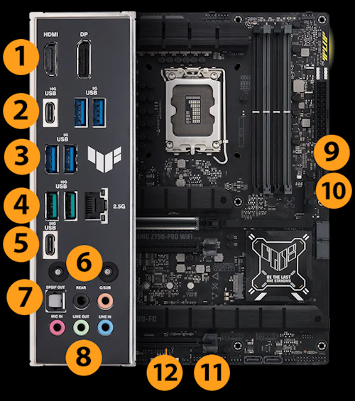 Die TUF GAMING Z790 Mainboards bieten ein funktionsreiches Hochleistungs-Gaming-Paket mit ultraschnellen Netzwerken für ein reibungsloses Online-Gameplay, erstklassigem Audio mit Positionsangaben für FPS-Gaming und integrierter RGB-Beleuchtung, die sich mit den angeschlossenen Geräten synchronisiert, um deine Spielatmosphäre zu personalisieren.