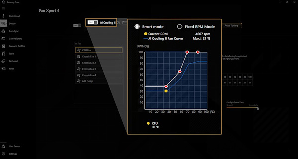 TUF GAMING Z790 Mainboards verfügen über eine umfassende Lüftersteuerung, die über das Dienstprogramm Fan Xpert 4 in Armoury Crate oder über das preisgekrönte ASUS UEFI BIOS konfiguriert werden kann.