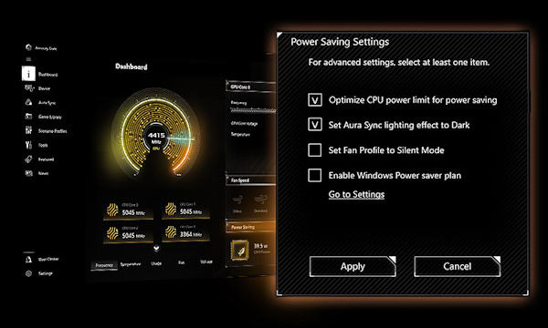 Allround-Energieeffizienz Die Energiesparfunktion enthält mehrere Einstellungen, mit denen du den Stromverbrauch ganz einfach optimieren und die Energieeinsparungen maximieren kannst. Du kannst eine CPU-Leistungsbegrenzung aktivieren, die Aura-Beleuchtung verdunkeln und das Lüfterprofil auf einen Energiesparmodus einstellen. Du kannst auch den Energiesparplan, der in Microsoft Windows integriert ist, umschalten.