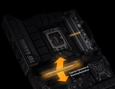 SafeSlot ist eine verstärkte Metallumhüllung, die einem PCIe®-Steckplatz hinzugefügt wird, um eine Karte sicher zu befestigen. Da PCIe® 5.0 doppelt so schnell ist wie PCIe® 4.0, hat ASUS die SMT-Fertigungsprozesse für den schnelleren SafeSlot verbessert – alles, um sicherzustellen, dass die Nutzer die höchstmöglichen Datengeschwindigkeiten erhalten. Darüber hinaus unterstützt und schützt die ASUS SafeDIMM-Ummantelungen Speichermodule auf ausgewählten ASUS-Mainboards und ermöglicht es dir, Module schnell, präzise und sicher einzusetzen.