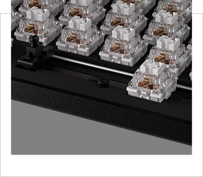 Ein speziell abgestimmter, geschmierter Switch-Stabilisator reduziert die Reibung beim Tastenanschlag im Vergleich zu herkömmlichen Stabilisierungsmechanismen erheblich und sorgt so für einen gleichmäßigen und stabilen Tastenanschlag bei längeren Tasten wie der Leertaste, der Umschalttaste und der Eingabetaste.