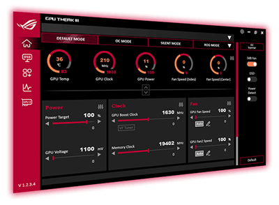 ASUS GPU Tweak III ist intuitiver und funktionsreicher als je zuvor. Die überarbeitete Benutzeroberfläche bietet eine bessere Zugänglichkeit, indem sie die wichtigsten Funktionen in einem zentralen Dashboard zusammenfasst, und der Spannungs-Frequenz-Tuner wurde überarbeitet, um das Übertakten noch einfacher zu machen. Zusätzliche Goodies wie die 0dB-Lüftertechnologie, automatischer Profilwechsel, eine vollständig anpassbare Bildschirmanzeige und Protokollierungsfunktionen sorgen dafür, dass du das Beste aus deiner Grafikkarte herausholst.