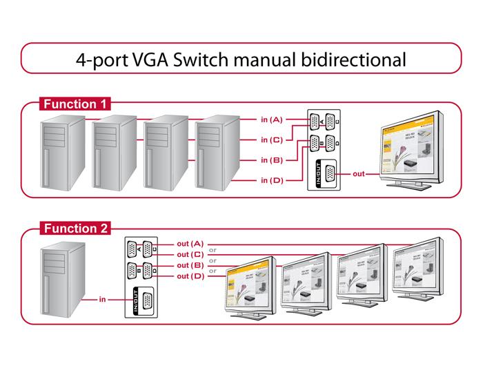 Sie können bis zu vier Computer mit VGA Anschluss an einen Monitor, TV oder Beamer etc. mit VGA Eingang anschließen. Per Knopfdruck lässt sich das Gerät auswählen, welches das Signal am Bildschirm wiedergeben soll.