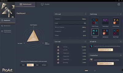 Eine benutzerfreundliche Oberfläche hilft, Arbeitsabläufe über ein zentrales System zu verbessern, das die Überwachung und Steuerung aller angeschlossenen ProArt-Produkte, einschließlich Motherboards und Displays, ermöglicht. 1. Lüfter-Modus Wählen Sie die bevorzugte Lüftereinstellung, um die Kühlleistung des Systems schnell zu konfigurieren. 2. Aufgaben gruppierenAnwendungen, die häufig zusammen verwendet werden, lassen sich in Gruppen zusammenfassen und mit einem einzigen Klick starten.