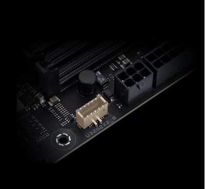 Ein USB 3.2 Gen 2x2 Anschluss steigert die Type-C Datenübertragung mit Geschwindigkeiten von bis zu 20 Gbps. Der Anschluss verfügt außerdem über die Quick Charge 4+ Technologie, mit der Geräte schnell mit bis zu 60 W aufgeladen werden können, wenn ein PCIe-Netzteilkabel in den nahegelegenen 6-poligen Anschluss eingesteckt wird.