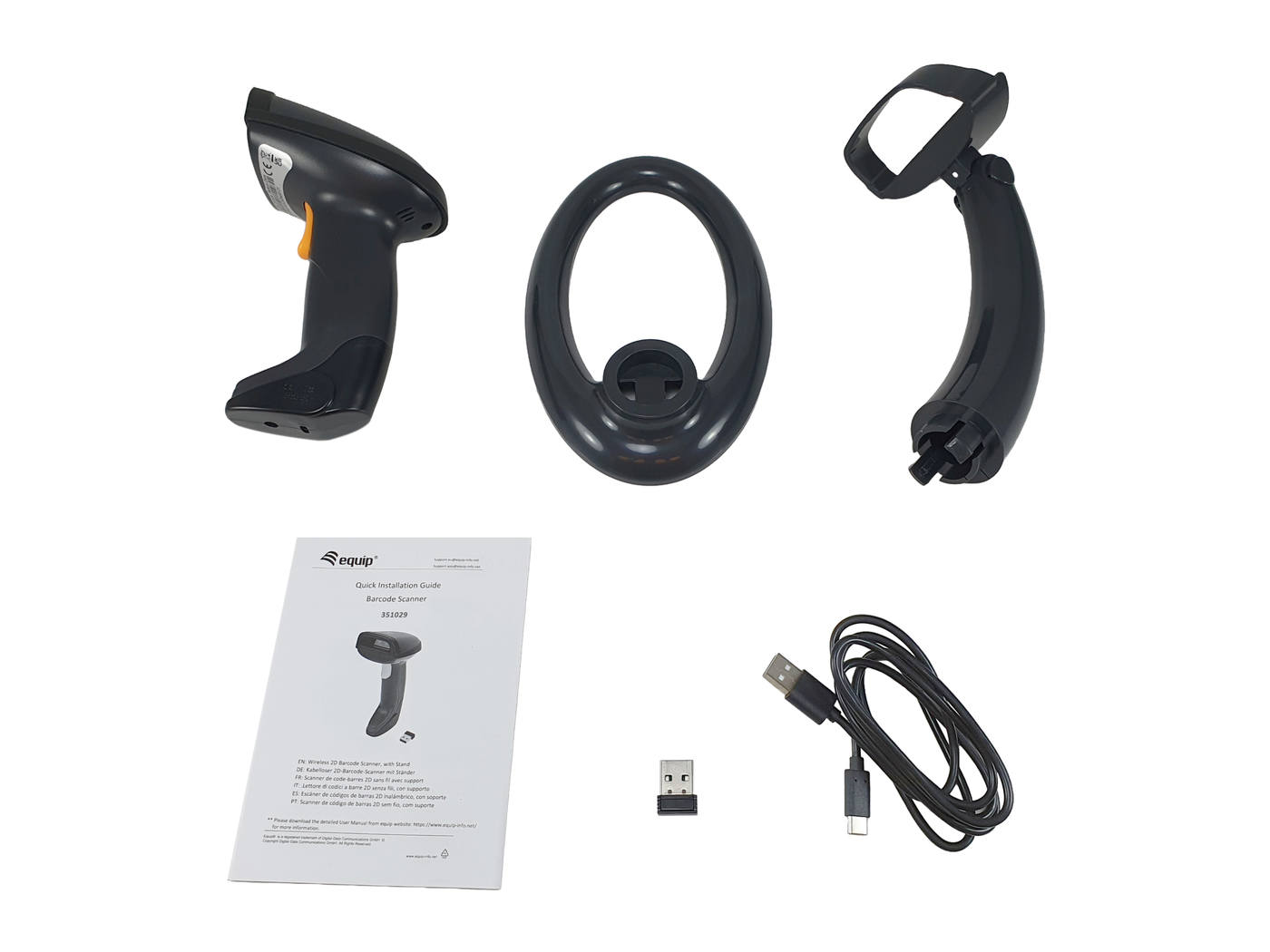 Equip Kabelloser 2D-Dualmodus-Barcodescanner mit 2,4 GHz und Bluetooth, mit Ständer. Typ: Tragbares Barcodelesegerät, Scanner-Typ: 1D/2D, Sensor-Typ: CMOS. Übertragungstechnik: Kabellos, Standard-Schnittstellen: Bluetooth, RF Wireless, Funkfrequenz: 2400 MHz. Produktfarbe: Schwarz, Gehäusematerial: Acrylnitril-Butadien-Styrol (ABS), Internationale Schutzart (IP-Code): IP54. Energiequelle: Akku, Akku-/Batterietechnologie: Lithium-Ion (Li-Ion), Akku-/Batterietyp: Integrierte Batterie. Gewicht: 187 g, Breite: 72 mm, Tiefe: 101 mm