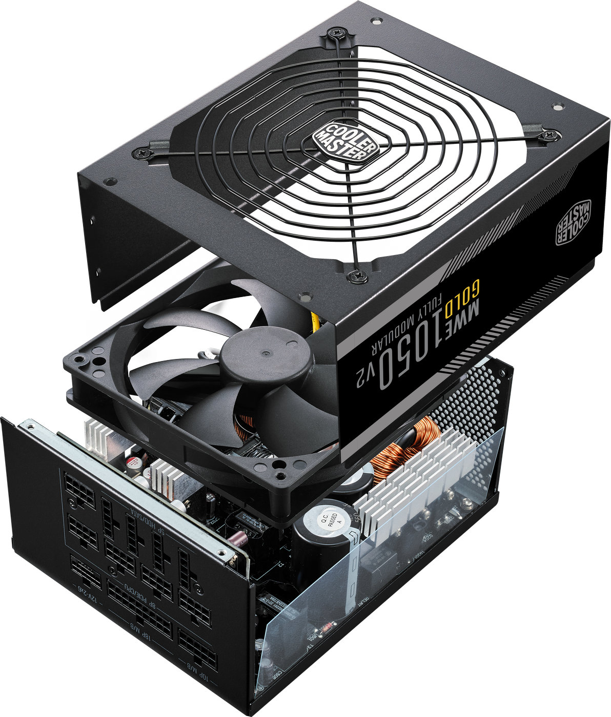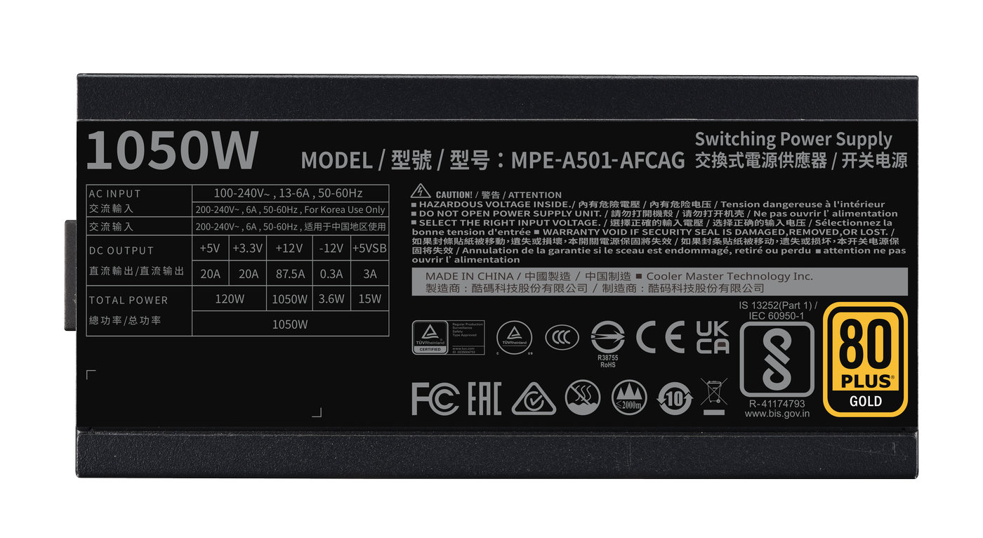 Cooler Master MWE Gold 1050 V2 ATX 3.1. Gesamtleistung: 1050 W, AC Eingangsspannung: 100 - 240 V, AC Eingangsfrequenz: 50/60 Hz. Motherboard Anschlussstecker: 24-pin ATX, Stromkabellänge Motherboard: 65 cm, SATA-Netzkabellänge: 500,620,740,860 mm. Zweck: PC, Stromversorgungseinheit (PSU) Formfaktor: ATX, 80 Plus Zertifizierung: 80 PLUS Gold. Produktfarbe: Schwarz, Kühlung: Aktiv, Lüfterdurchmesser: 14 cm. Zertifizierung: TUV, cTUVus, CE, FCC, BSMI, CCC, EAC, RCM, UKCA, BIS