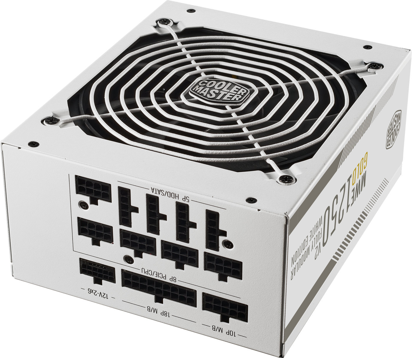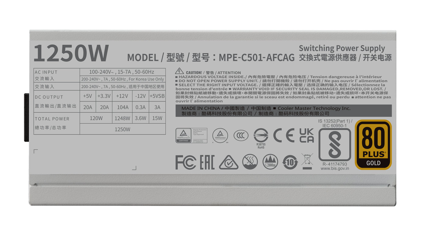 Cooler Master MWE Gold 1250 V2 ATX 3.1 White Edition. Gesamtleistung: 1250 W, AC Eingangsspannung: 100 - 240 V, AC Eingangsfrequenz: 50/60 Hz. Motherboard Anschlussstecker: 24-pin ATX, Stromkabellänge Motherboard: 65 cm, SATA-Netzkabellänge: 500,620,740,860 mm. Zweck: PC, Stromversorgungseinheit (PSU) Formfaktor: ATX, 80 Plus Zertifizierung: 80 PLUS Gold. Produktfarbe: Weiß, Kühlung: Aktiv, Lüfterdurchmesser: 14 cm. Zertifizierung: TUV, cTUVus, CE, FCC, BSMI, CCC, EAC, RCM, UKCA, BIS